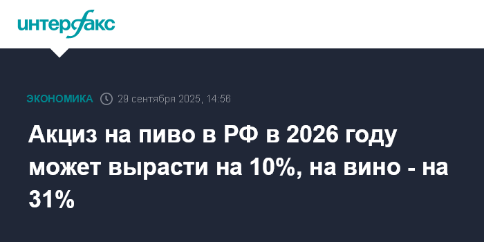 Акциз на пиво в РФ в 2026 году может вырасти на 10%, на вино - на 31%