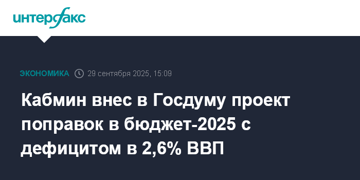 Москва. 29 сентября. INTERFAX.RU - В Госдуму поступил законопроект о внесении изменений в бюджет 2025 года, предусматривающий рост дефицита с 1,7% ВВП до 2,6% ВВП. Текст документа и сопровождающих материалов опубликован в базе нижней палаты парламента.