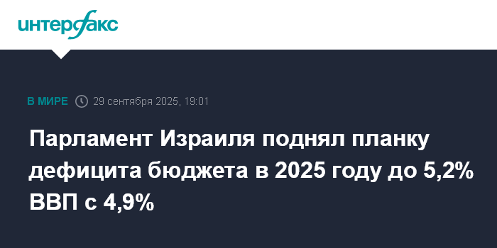 Москва. 29 сентября. INTERFAX.RU - Парламент Израиля окончательно утвердил повышение предельного размера дефицита бюджета страны до 5,2% ВВП с 4,9% ВВП.