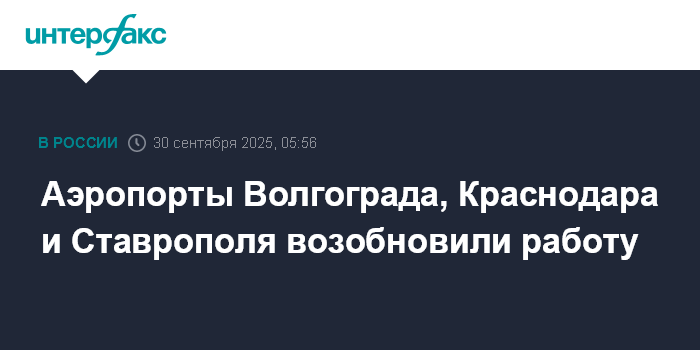 Москва. 30 сентября. INTERFAX.RU - Аэропорты Волгограда, Краснодара и Ставрополя снова принимают и отправляют самолеты, сообщили во вторник в Росавиации.