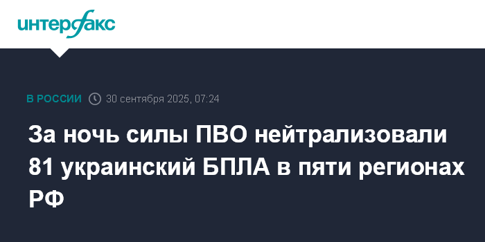 Москва. 30 сентября. INTERFAX.RU - В течение прошедшей ночи средства ПВО перехватили и уничтожили 81 украинский беспилотник в Воронежской, Белгородской, Ростовской, Курской и Волгоградской областях, заявили в Министерстве обороны России.