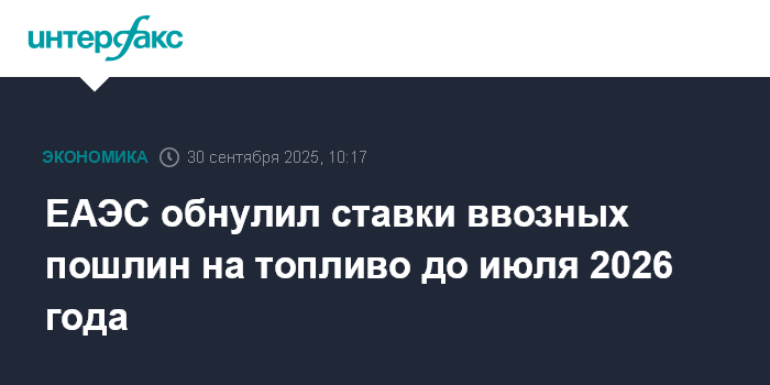 Москва. 30 сентября. INTERFAX.RU - Совет Евразийской экономической комиссии (ЕЭК) обнулил таможенные пошлины на ввоз в Евразийский экономический союз (ЕАЭС, включая Россию, Армению, Белоруссию, Казахстан и Киргизию) моторного бензина, топлива для реактивных двигателей, дизельного топлива, судового топлива и прочих газойлей до 30 июня 2026 года включительно.