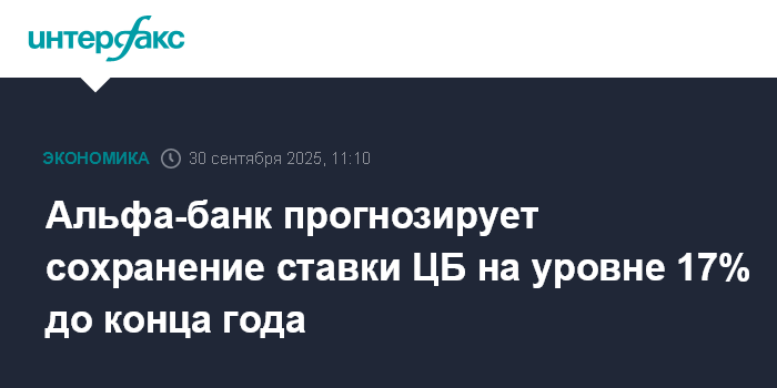 Москва. 30 сентября. INTERFAX.RU - Альфа-банк прогнозирует сохранение ключевой ставки Банка России на уровне 17% до конца текущего года, говорится в обзоре главного экономиста банка Наталии Орловой. Ранее эксперт ориентировалась на ее снижение до 15%.