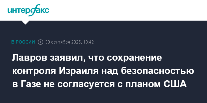 Москва. 30 сентября. INTERFAX.RU - Идея сохранить контроль Израиля над обеспечением безопасности в секторе Газа после прекращения огня не согласуется с планом США, по которому там должны быть сформированы международные силы, заявил министр иностранных дела РФ Сергей Лавров.