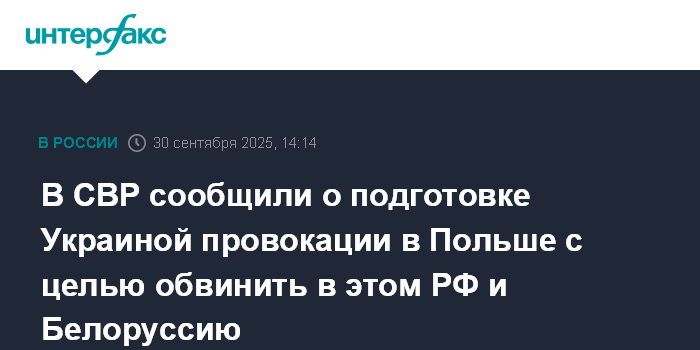Москва. 30 сентября. INTERFAX.RU - По информации Службы внешней разведки РФ, Киев готовит провокацию в Польше с целью втягивания европейских стран НАТО в конфликт с Россией, заявили в пресс-бюро СВР.