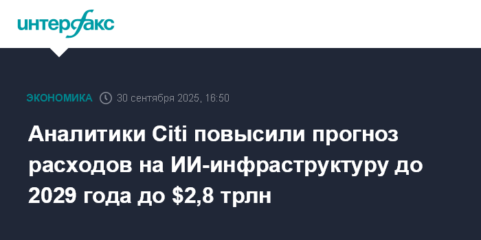 Москва. 30 сентября. INTERFAX.RU -Аналитики Citigroup Inc. повысили прогноз затрат на развитие инфраструктуры, необходимой для работы технологий искусственного интеллекта, на период до конца 2029 года до $2,8 трлн с ожидавшихся ранее $2,3 трлн, сообщает Reuters.