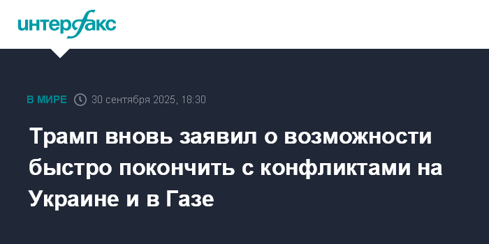 Москва. 30 сентября. INTERFAX.RU - Президент США Дональд Трамп вновь заявил о возможности быстро положить конец конфликту на Украине.