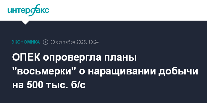 Москва. 30 сентября. INTERFAX.RU - Секретариат ОПЕК опроверг появившуюся во вторник в мировых СМИ информацию о планах восьми стран-участниц ОПЕК+ рассмотреть вариант ускоренного выхода из добровольных ограничений и перейти к наращиванию добычи по 500 тыс. б/с в течение трех месяцев, говорится в заявлении ОПЕК.