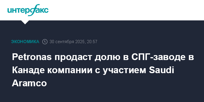 Petronas продаст долю в СПГ-заводе в Канаде компании с участием Saudi Aramco