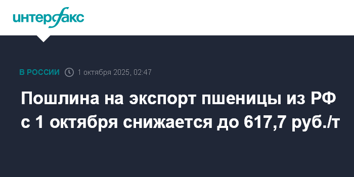Москва. 1 октября. INTERFAX.RU - Ставка пошлины на экспорт пшеницы из РФ с 1 октября составит 617,7 рубля против 655,6 рубля за тонну неделей ранее, сообщает Минсельхоз.