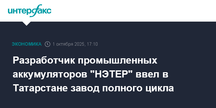 Москва. 1 октября. INTERFAX.RU - Татарстанское ООО "Батареон", разработчик и поставщик литиевых аккумуляторных систем под брендом "НЭТЕР", в среду открыло свой первый завод полного цикла по выпуску литий-ионных аккумуляторных батарей. Об этом сообщила пресс-служба главы республики Рустама Минниханова, принявшего участие в церемонии открытия.