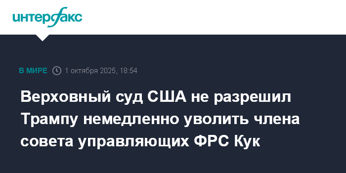 Москва. 1 октября. INTERFAX.RU - Верховный суд США отказался разрешить президенту страны Дональду Трампу незамедлительно уволить члена совета управляющих Федеральной резервной системы (ФРС) Лизу Кук.