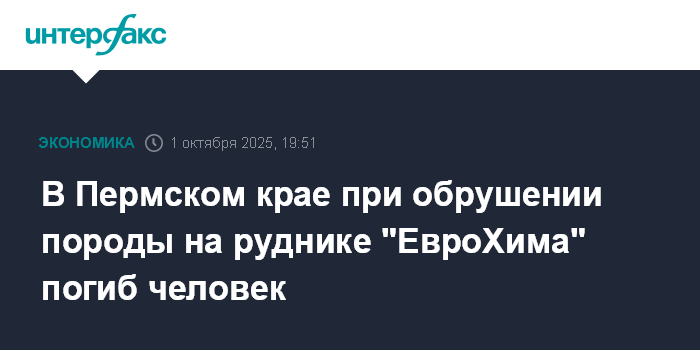 Москва. 1 октября. INTERFAX.RU - В Березниках произошло обрушение горной породы на Усольском калийном комбинате "ЕвроХима" (ООО "ЕвроХим - Усольский калийный комбинат"), погиб человек, сообщает сайт Госинспекции труда Пермского края.