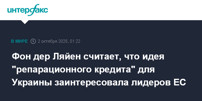 Москва. 2 октября. INTERFAX.RU - Председатель Еврокомиссии (ЕК) Урсула фон дер Ляйен заявила, что лидеры стран ЕС проявили интерес к ее предложению о "репарационном кредите" для Украины за счет замороженных российских активов.