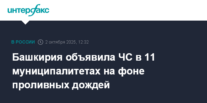 Москва. 2 октября. INTERFAX.RU - Правительство Башкирии на фоне проливных дождей ввело режим чрезвычайной ситуации в 11 районах из 54, сообщили "Интерфаксу" в республиканском Минсельхозе.