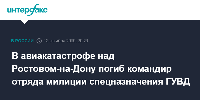 Ростов-на-Дону. 13 октября. INTRFAX.RU - Командир отряда милиции спецназначения ГУВД по Ростовской области полковник милиции Михаил Перов погиб в авиакатастрофе, произошедшей в районе села Никольское Неклиновского района (Ростовская область).