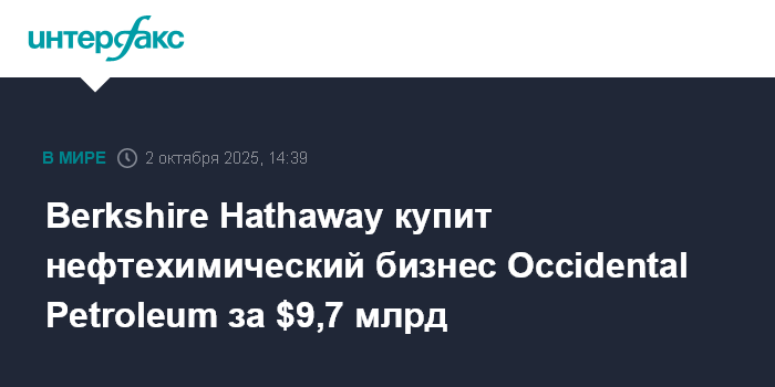 Москва. 2 октября. INTERFAX.RU - Инвесткомпания американского миллиардера Уоррена Баффета Berkshire Hathaway договорилась о покупке нефтехимического подразделения Occidental Petroleum примерно за $9,7 млрд, говорится в сообщении покупателя.
