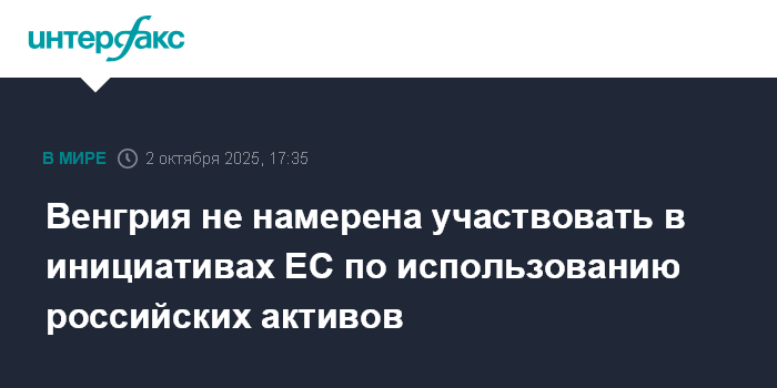 Москва. 2 октября. INTERFAX.RU - Венгрия не намерена участвовать в инициативах ЕС по использованию российских активов для помощи Украине, заявил в четверг венгерский премьер Виктор Орбан.