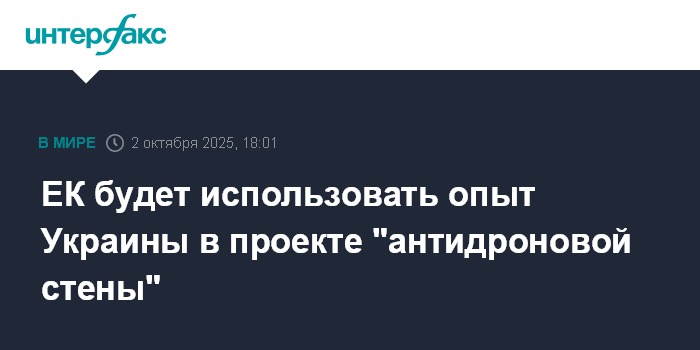 Москва. 2 октября. INTERFAX.RU - В Еврокомиссии (ЕК) рассчитывают использовать опыт Украины в борьбе против БПЛА, и ее представители участвуют в обсуждениях темы "антидроновой стены" ЕС, заявил официальный представитель ЕК Тома Ренье.