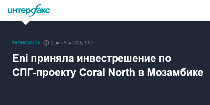 Москва. 2 октября. INTERFAX.RU - Итальянская Eni (50%) и ее партнеры - китайская CNPC (20%), мозамбикская ENH (10%), корейская Kogas (10%) и XRG (10%, дочерняя компания арабской ADNOC) - приняли окончательное инвестрешение по разработке проекта плавучего завода по сжижению природного газа Coral North FLNG на глубоководном шельфе Кабу-Делгаду к северу от Мозамбика.