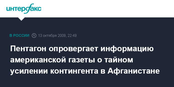 Вашингтон. 13 октября. ИНТЕРФАКС - Пентагон во вторник опроверг информацию СМИ, согласно которой президент США Барак Обама якобы принял без каких-либо объявлений решение направить в Афганистан еще 13 тыс. солдат в дополнение к 21-тысячному подкреплению, о котором стало известно в марте этого года.