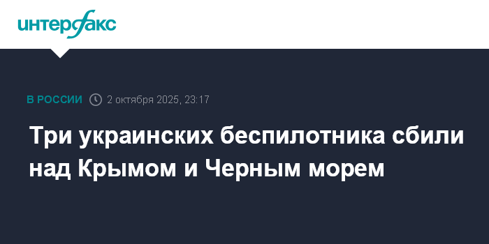 Москва. 2 октября. INTERFAX.RU - Силы ПВО сбили три украинских беспилотных летательных аппарата над акваторией Черного моря и Крымом, сообщило Минобороны РФ.