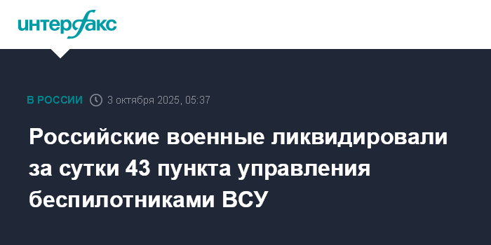 Москва. 3 октября. INTERFAX.RU - Подразделения группировки войск "Запад" в течение суток уничтожили 43 украинских пункта управления беспилотниками, сообщил начальник пресс-центра группировки Иван Бигма.