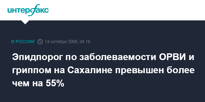 Южно-Сахалинск. 14 октября. ИНТЕРФАКС - ДАЛЬНИЙ ВОСТОК - Эпидпорог по заболеваемости ОРВИ и гриппом среди населения Сахалинской области превышен на 56,2% во всех возрастных группах населения.