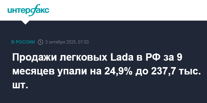 Москва. 3 октября. INTERFAX.RU - Продажи легковых автомобилей Lada на российском рынка в январе-сентябре 2025 года снизились на 24,9%, до 237,706 тыс. единиц, доля рынка бренда составила 26,5% (-0,9 п.п.), подсчитали в "Автостате".