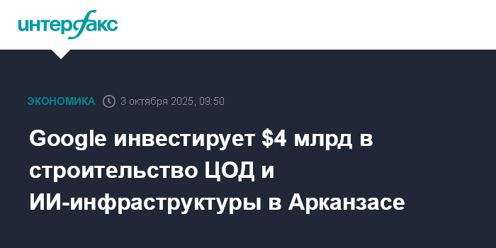 Москва. 3 октября. INTERFAX.RU - Американская Google (принадлежит Alphabet Inc.) намерена инвестировать $4 млрд в строительство центра обработки данных (ЦОД) в Арканзасе, а также в облачную и ИИ-инфраструктуру в штате.
