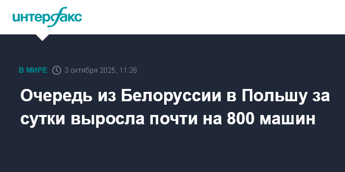 Москва. 3 октября. INTERFAX.RU - За минувшие сутки очередь грузовых и легковых автомобилей на въезд из Белоруссии в Польшу увеличилась на 770 машин, сообщили в пятницу в Госпогранкомитете республики.