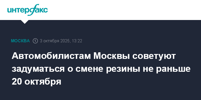 Москва. 3 октября. INTERFAX.RU - Автомобилистам в Москве пока не стоит задумываться о смене летней резины на зимнюю, к этому вопросу можно вернуться ближе к 20 октября, сообщил на пресс-конференции научный руководитель Гидрометцентра Роман Вильфанд.