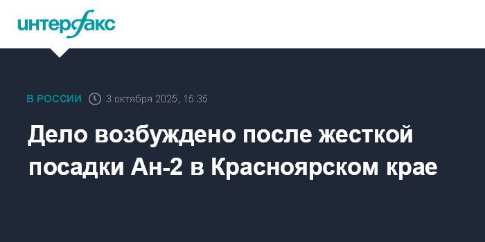 Москва. 3 октября. INTERFAX.RU - В Красноярском крае возбуждено уголовное дело по факту жесткой посадки самолета Ан-2, сообщает Восточное межрегиональное следственное управление на транспорте СК РФ.