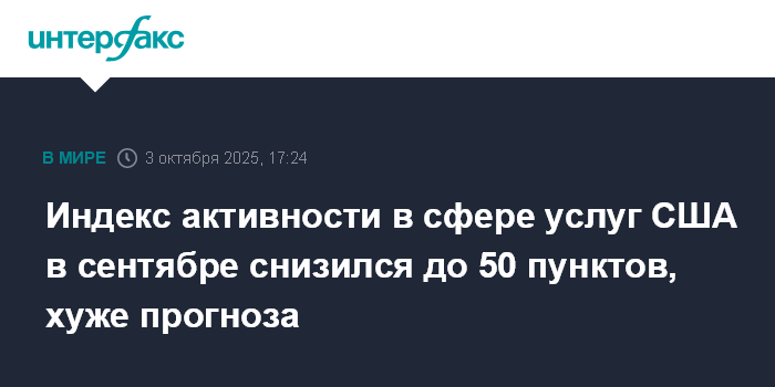 Москва. 3 октября. INTERFAX.RU - Индекс деловой активности в сфере услуг США (ISM Services) в сентябре снизился до 50 пунктов, сообщил Институт управления поставками (ISM).
