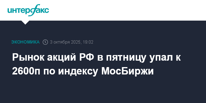 Москва. 3 октября. INTERFAX.RU - Рынок акций РФ в пятницу продолжил снижение в отсутствие оптимистичных новостей в условиях сохраняющейся геополитической напряженности, санкционных рисков со стороны Запада и ожиданий паузы в цикле смягчения монетарной политики ЦБ РФ из-за вероятного повышения инфляции после планируемого роста налогов с нового года; фактором поддержки выступила подросшая нефть (фьючерс на Brent поднялся к $64,7 за баррель). Индекс МосБиржи откатился в район 2600 пунктов, обновив минимум закрытия торгов с 19 декабря 2024 года, после утреннего коррекционного роста к 2650 пунктам.