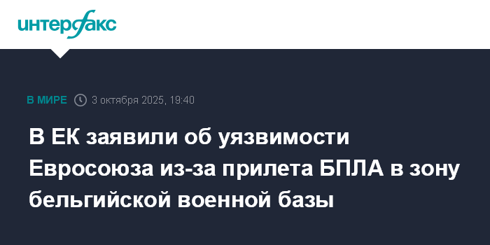 Москва. 3 октября. INTERFAX.RU - Появление неопознанных БПЛА в ночь на пятницу в районе бельгийской военной базы Эльзенборн близ границы с Германией свидетельствует о слабой защищённости воздушного пространства ЕС, заявил представитель Еврокомиссии (ЕК) Тома Ренье.