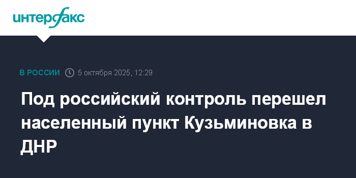 Москва. 5 октября. INTERFAX.RU - Вооружённые силы России взяли под контроль населённый пункт Кузьминовка в ДНР, сообщило министерство обороны РФ в воскресенье.