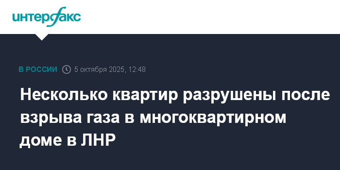 Москва. 5 октября. INTERFAX.RU - Взрыв бытового газа произошел в многоквартирном доме в городе Красный Луч Луганской Народной Республики, разрушены несколько квартир, сообщил глава администрации городского округа Сергей Соловьев.