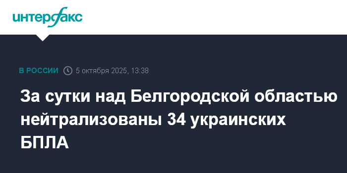 Москва. 5 октября. INTERFAX.RU - Губернатор Белгородской области Вячеслав Гладков сообщил об уничтожении 34 украинских беспилотников подразделениями "БАРС-Белгород" и "Орлан" за минувшие сутки.