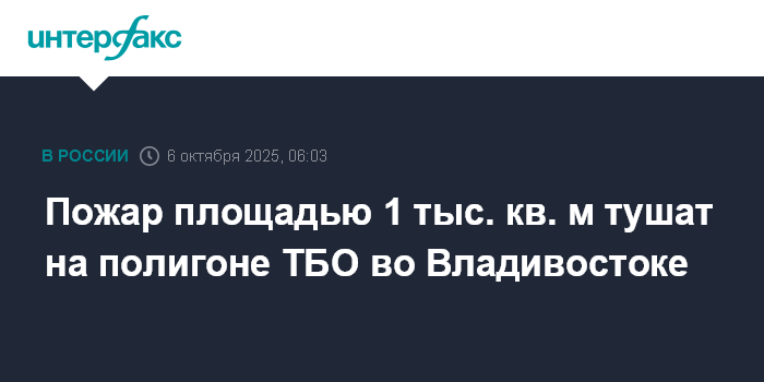 Москва. 6 октября. INTERFAX.RU - Пожарные тушат возгорание площадью около 1 тыс. кв. м на полигоне твердых бытовых отходов (ТБО) во Владивостоке, сообщает в понедельник краевой главк МЧС.