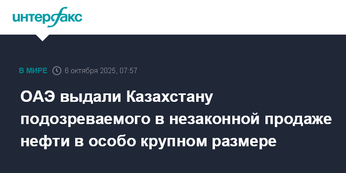 Москва. 6 октября. INTERFAX.RU - Из Объединенных Арабских Эмиратов экстрадирован на родину гражданин Казахстана, подозреваемый в незаконной продаже нефтепродуктов в особо крупном размере, сообщила в понедельник пресс-служба Генпрокуратуры республики.