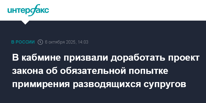 Москва. 6 октября. INTERFAX.RU - Правительство РФ высказало замечания к законопроекту об обязательной попытке примирения разводящихся супругов, сообщил источник, знакомый с проектом соответствующего отзыва кабмина.