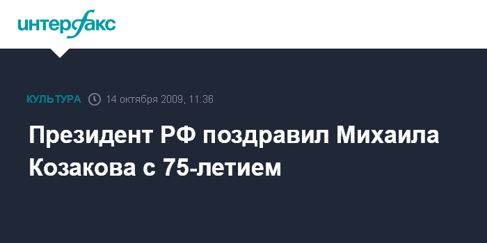 Москва. 14 октября. INTERFAX.RU - Президент России Дмитрий Медведев поздравил артиста и режиссера театра и кино, актера Государственного театра имени Моссовета, народного артиста РСФСР, лауреата Госпремий РСФСР и СССР Михаила Козакова с 75-летием. "Разносторонне одаренный человек, Вы в полной мере реализовали себя как прекрасный актер и талантливый режиссер. Зрители искренне любят Вас и хорошо помнят образы, созданные Вами. Многие фильмы с Вашим участием вошли в классику отечественного кинематографа и принесли Вам заслуженное профессиональное признание", - говорится в поздравительной телеграмме, текст которой цитирует в среду пресс-служба Кремля.