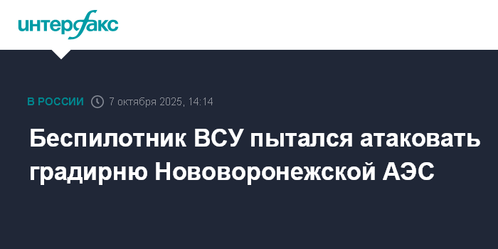 Москва. 7 октября. INTERFAX.RU - Боевой беспилотник ВСУ пытался атаковать градирню Нововоронежской АЭС, разрушений и пострадавших нет, сообщает "Росэнергоатом".