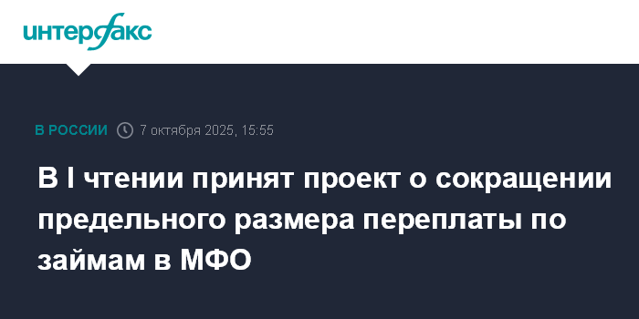 Москва. 7 октября. INTERFAX.RU - Госдума приняла в первом чтении законопроект, который ограничивает переплату по краткосрочным (до года) потребительским займам микрофинансовых организаций (МФО), снижая ее максимальный размер со 130% до 100%.