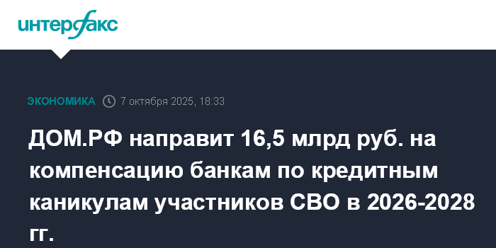 Москва. 7 октября. INTERFAX.RU - Субсидии ПАО "ДОМ.РФ" для возмещения банкам недополученных доходов по процентам в период действия льготных кредитных программ для участников специальной военной операции (СВО) составят 16,5 млрд руб. за 2026-2028 гг., следует из заключения комитета Госдумы по финансовому рынку на проект федерального бюджета.