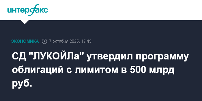 Москва. 7 октября. INTERFAX.RU - Совет директоров ПАО "ЛУКОЙЛ" во вторник утвердил программу биржевых облигаций серии 001Р, в рамках которой могут быть размещены бумаги максимальным номиналом 500 млрд руб. или эквивалент этой суммы в иностранной валюте, сообщил эмитент на ленте раскрытия информации.