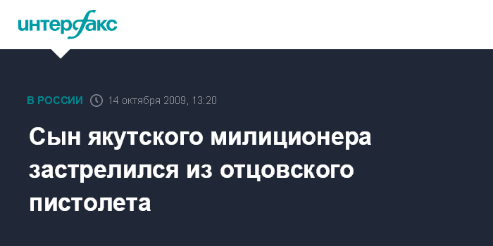 Якутск. 14 октября. INTERFAX.RU - Пятилетний сын сержанта милиции, проживающего в поселке Кызыл-Сыр (запад Якутии), погиб, выстрелив по неосторожности себе в голову из отцовского служебного пистолета.
