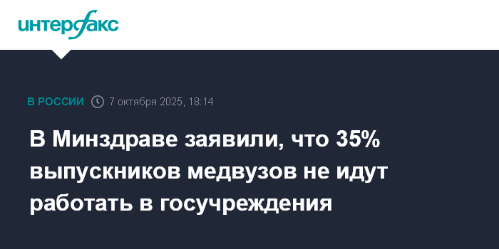 Москва. 7 октября. INTERFAX.RU - Около 35% выпускников медицинских вузов и не менее 40% выпускников программ среднего профобразования не идут работать в государственную систему здравоохранения в России после обучения, сообщила в Госдуме замглавы Минздрава Татьяна Семенова.