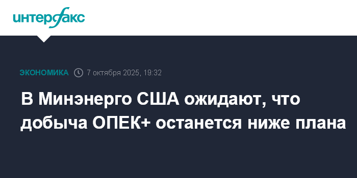 Москва. 7 октября. INTERFAX.RU - Минэнерго США ожидает значительного роста коммерческих запасов, до 2,6 млн б/с в IV квартале, и уровень останется высоким в течение 2026 года, хотя и полагает, что страны ОПЕК+ увеличат добычу нефти на объем, меньше анонсированного.
